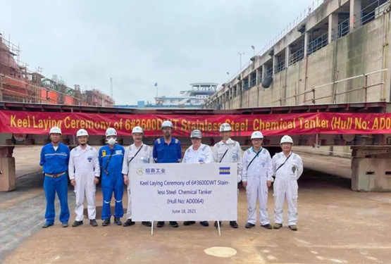 6月18日,由扬州金陵建造的3600吨不锈钢化学品6#船如期进坞。船东代表、船级社代表、扬州金陵3600项目负责人出席了进坞仪式。